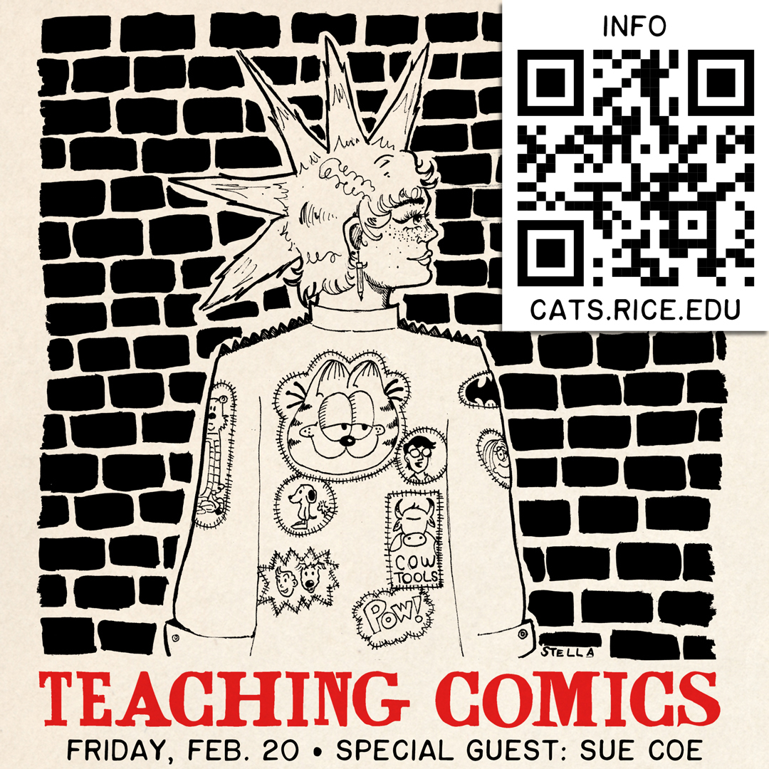 I’m organizing a one-day symposium on comics. It’s this Friday. The workshops are closed but you can still hear Sue Coe speak. Visit cats.rice.edu for more info including maps.