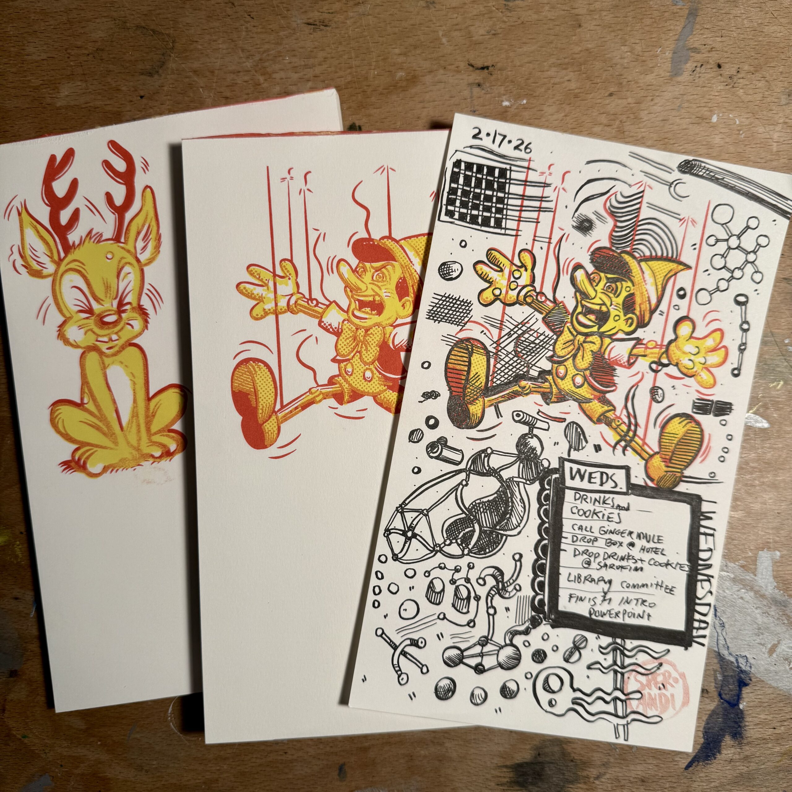 We’re also printing for Sue – Risographs and a linoleum block. Here’s a sneek peek of just one of the FOUR Riso prints we’re making for her. It’s Sunflower, Scarlet and Black on a buff cardstock. We aren’t selling these but Sue has amazing prints available on her website.